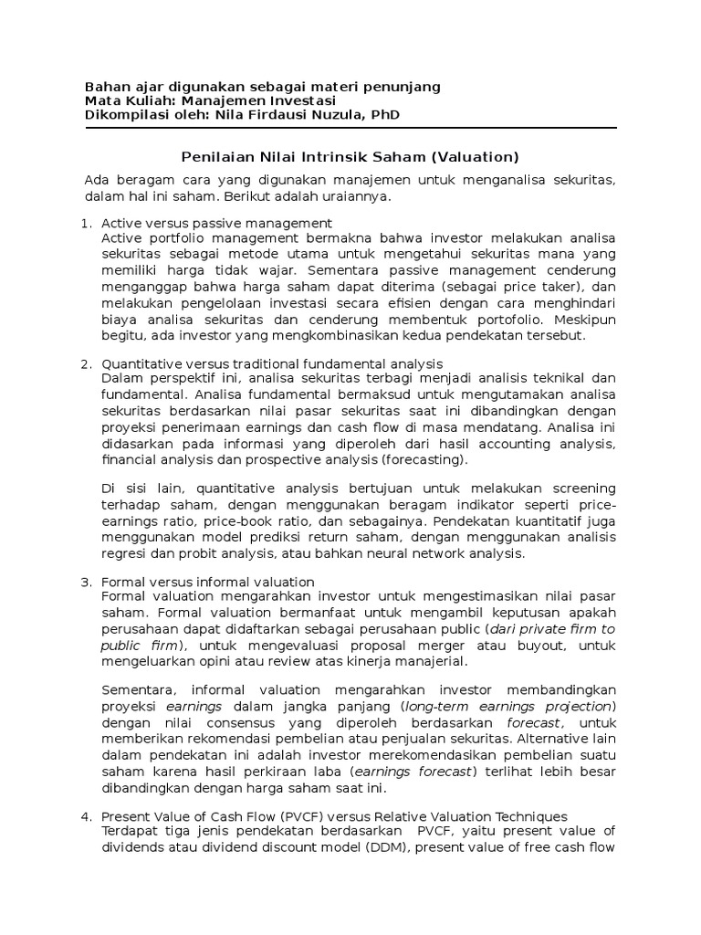 Nilai saham yang akan dibayar oleh investor tergantung dari hasil yang diharapkan untuk diterima dan resiko yang terkandung dalam transaksi pembelian saham. Berdasarkan spi 2007, pendekatan p asar membandingkan subyek bisnis yang sejenis, hak kepemilikan suatu bisnis dan sekuritas yang telah dijual di pasar. Download with google download with facebook.
